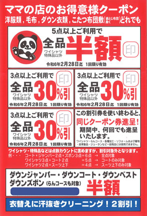 クリーニング料金が会員価格になります。1点につき30〜100円お得です。